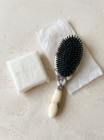An authentic Calacatta Viola marble hairbrush made with boar and nylon bristles to elevate your daily routines into rituals.